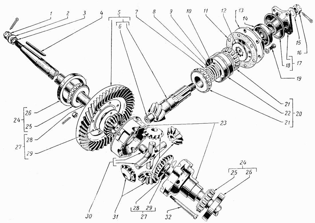 | 21 | показать на схеме | М-4621 | Кольцо внутреннее и ролики переднего подшипника ведущей шестерни |
